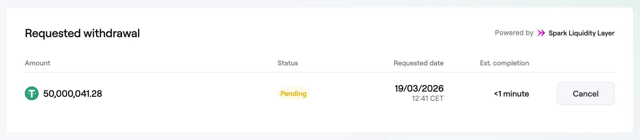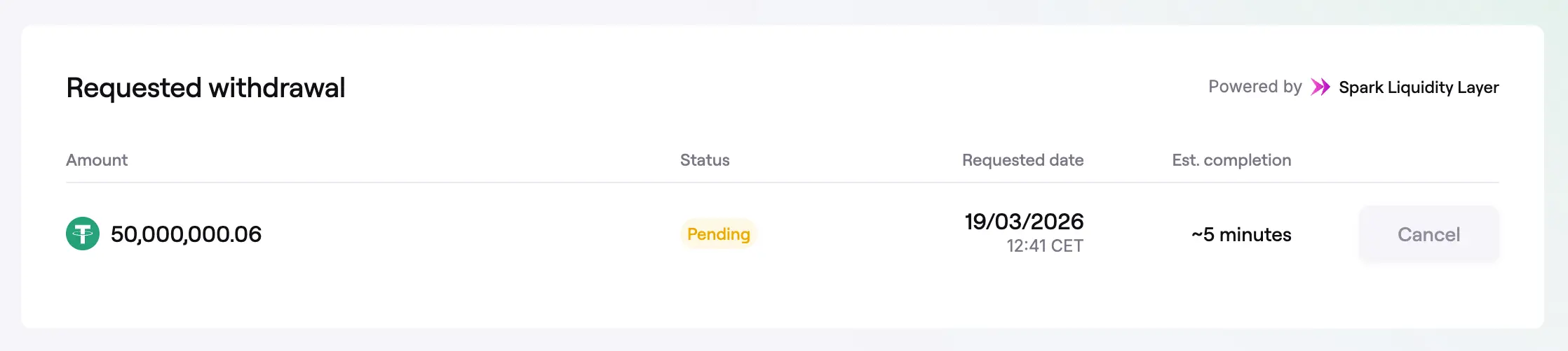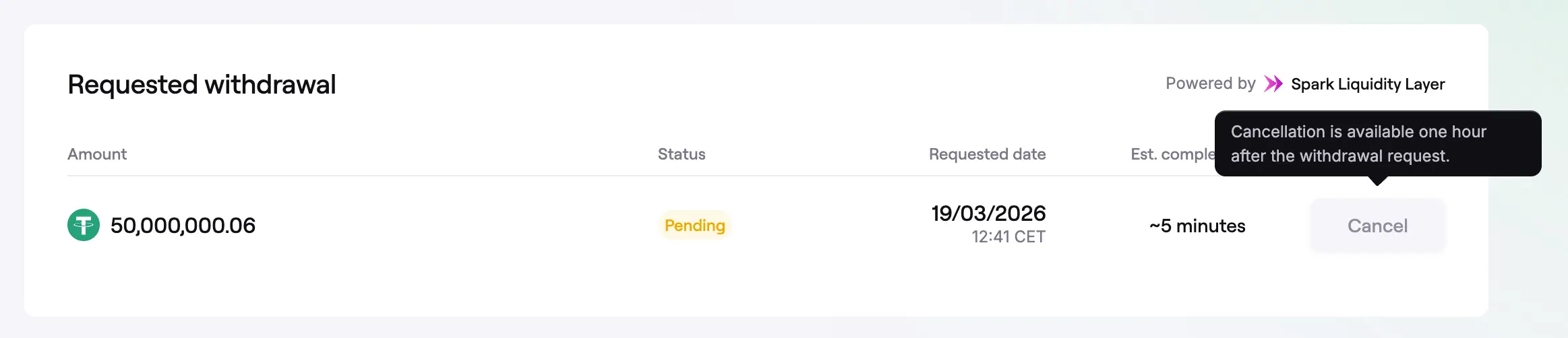 - If the Spark Liquidity Layer has not fulfilled the request within one hour, the Cancel button becomes available.