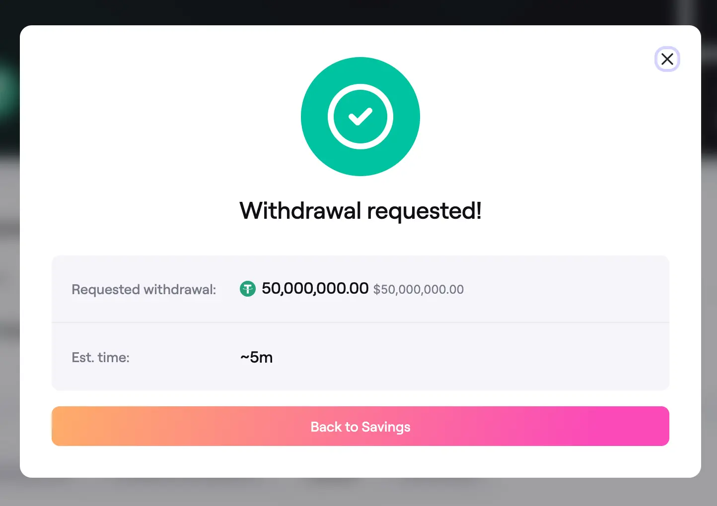 - After you close the dialog, the request will appear in the Requested withdrawal table on the Savings page with a Pending status and an estimated completion time.