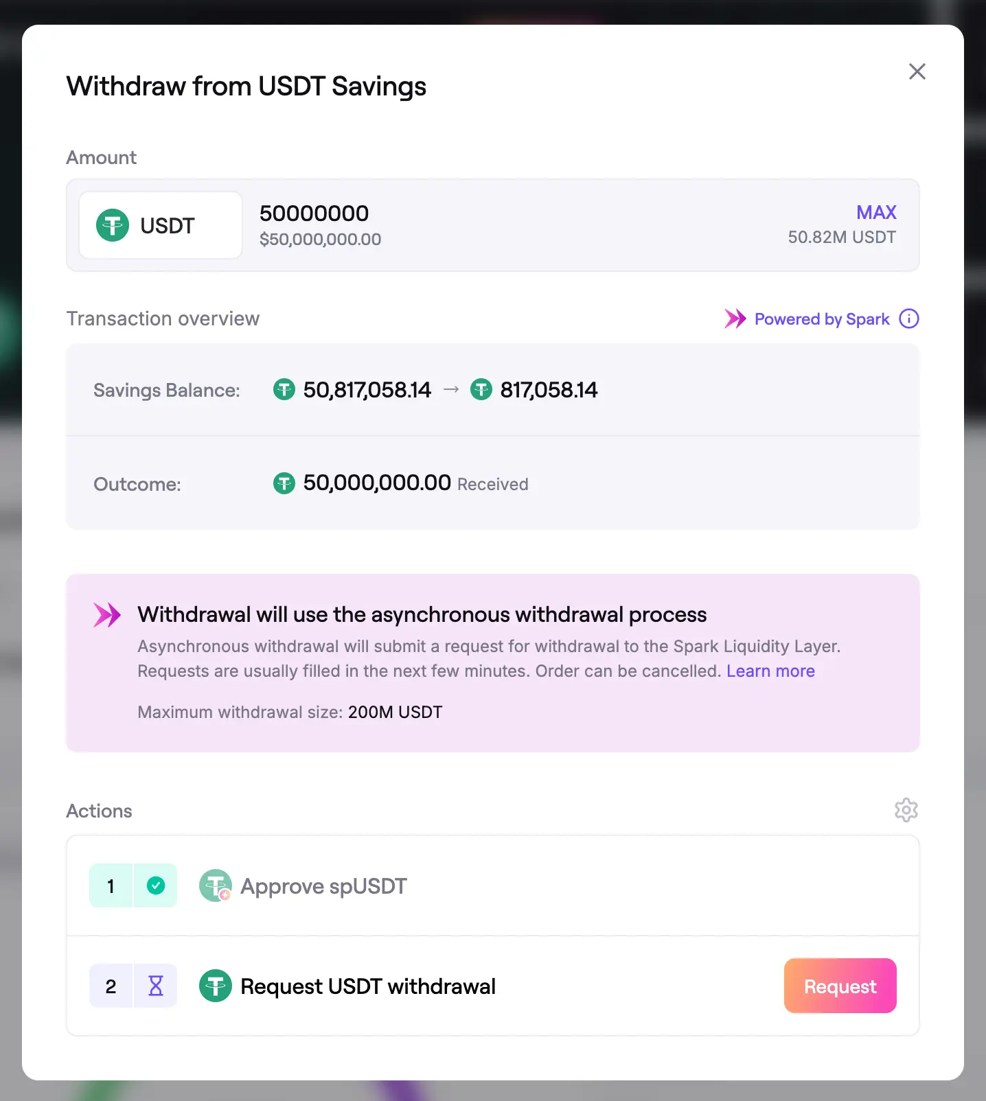 If the withdrawal will use Savings Liquidity Intents, the dialog will show that the request uses the asynchronous withdrawal process powered by the Spark Liquidity Layer.