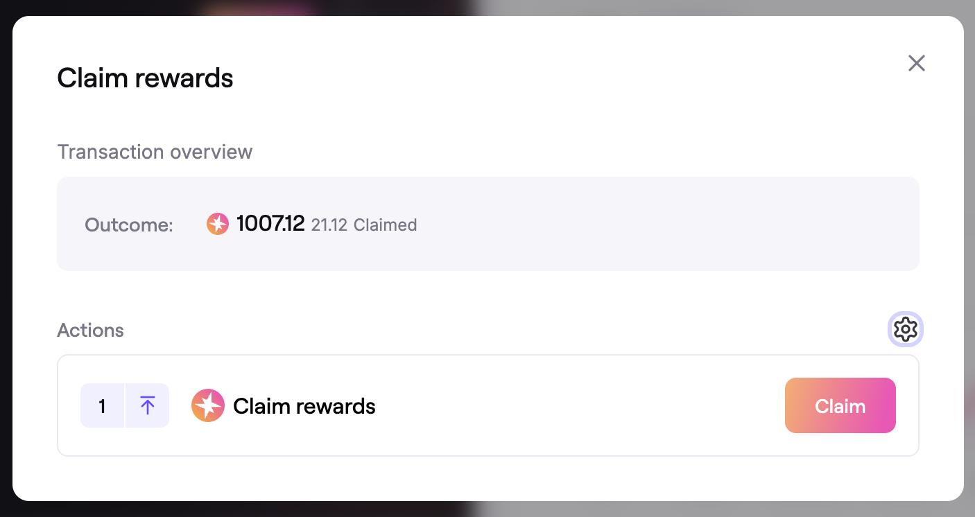 In the Claim rewards dialog, you will see a Transaction overview, which shows how many SPK tokens you are claiming. To claim the tokens, you must submit the transactions in the Actions panel.