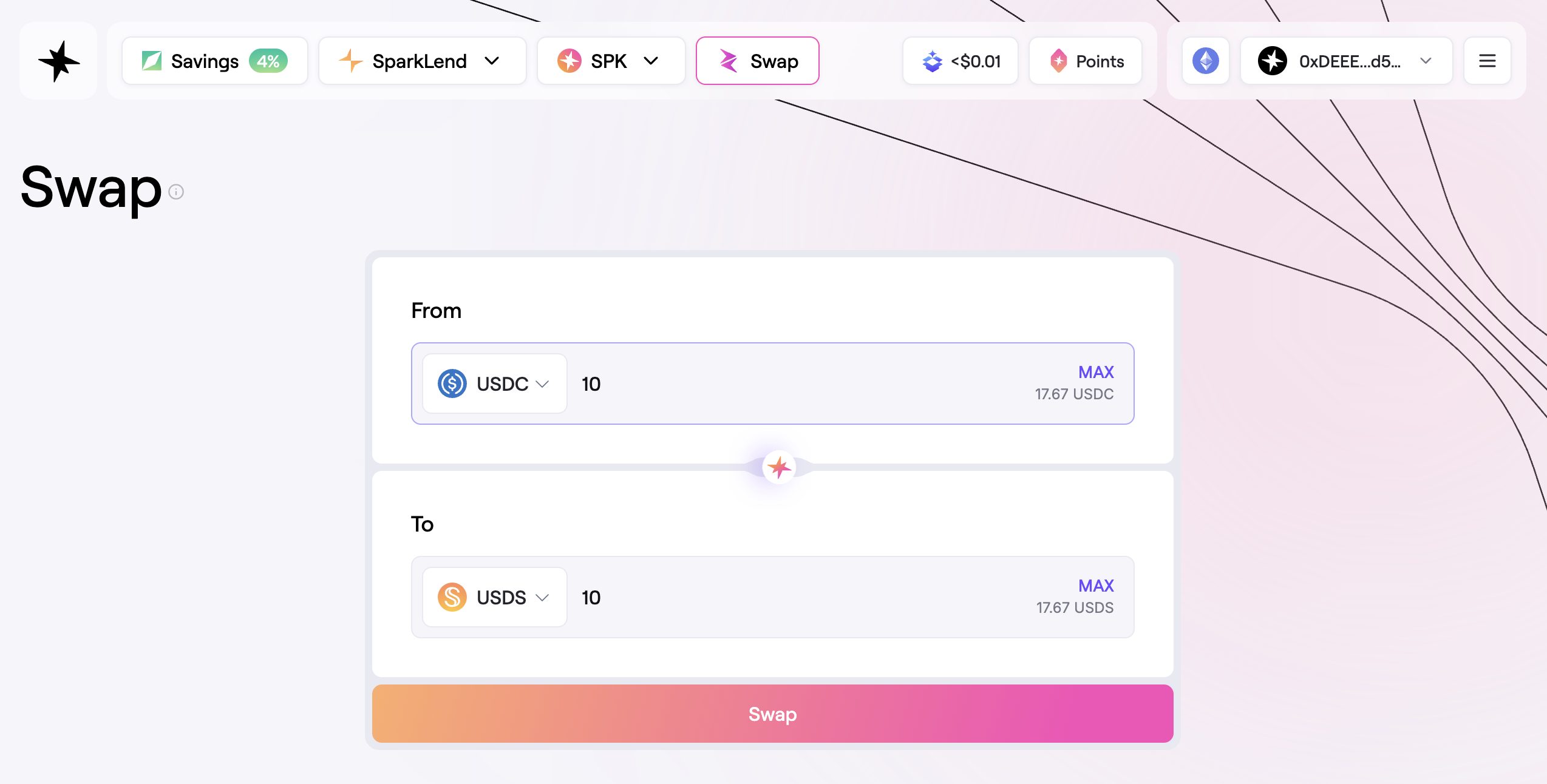 In this guide, you will learn how to swap between USDS, USDC and DAI. Spark enables easy conversion between these tokens at no slippage or fee beyond gas.