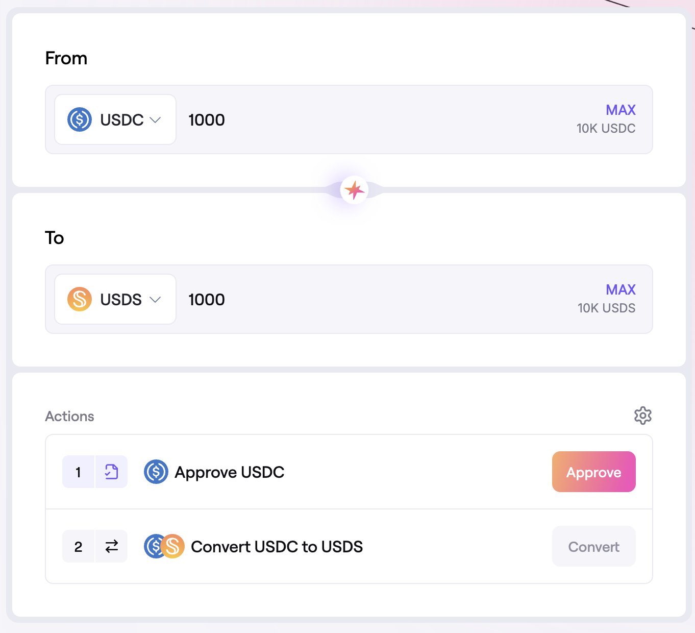 - Select the tokens and amounts you wish to swap from and to, for example 1000 USDC to 1000 USDS. Click Swap and submit the transactions in the Actions section.
