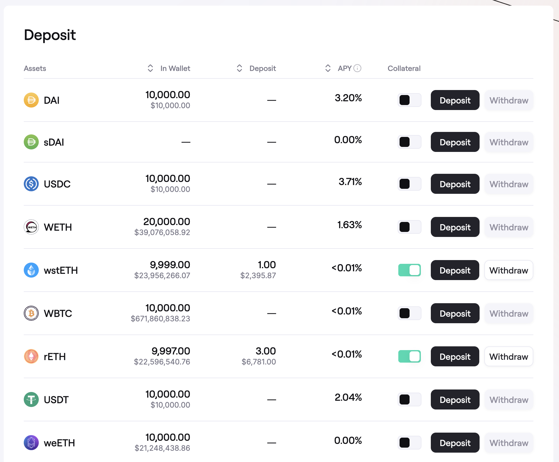 - In the Deposit section you can also enable or disable assets as collateral. Learn about this here.