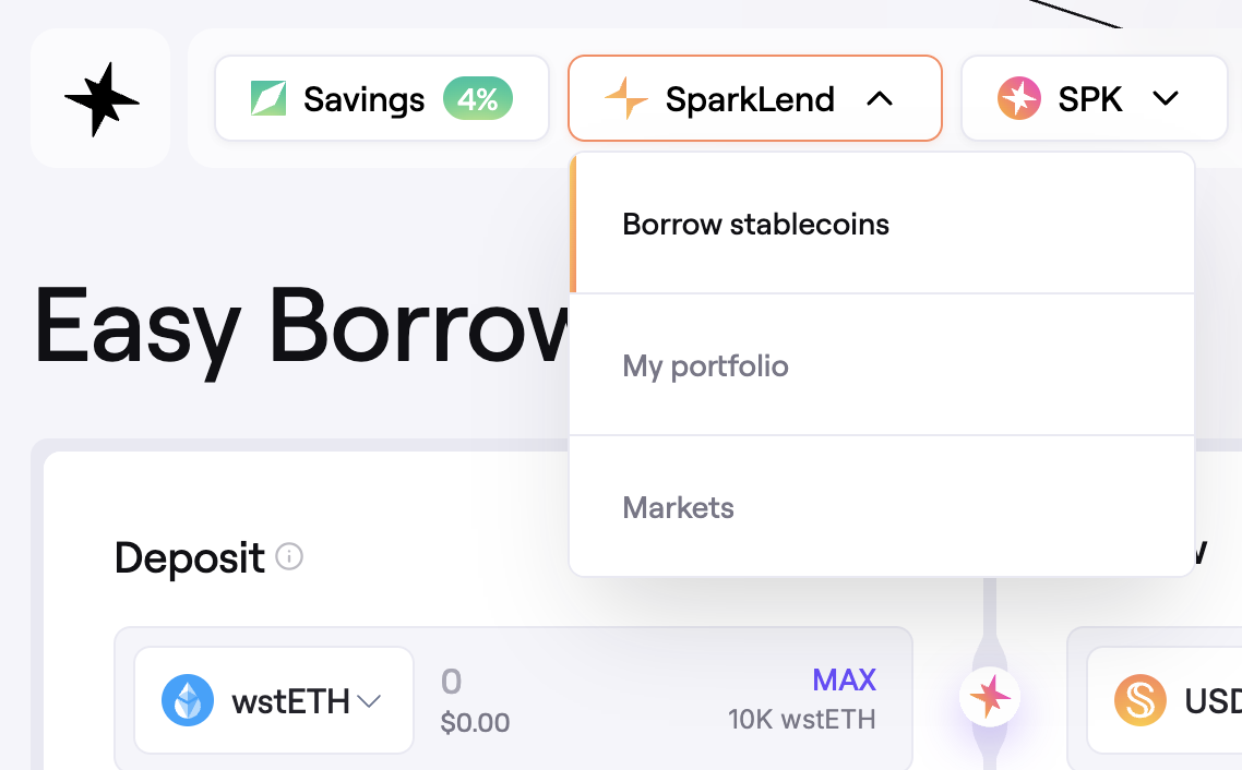 On the Borrow Stablecoins page, you can borrow stablecoins, by depositing crypto assets as collateral. If you wish to borrow other assets than stablecoins, navigate to the My portfolio page and follow the deposit assets and borrowing assets steps instead.
