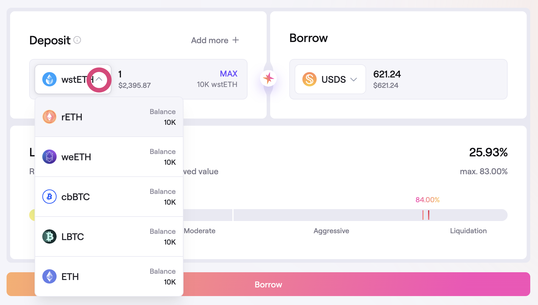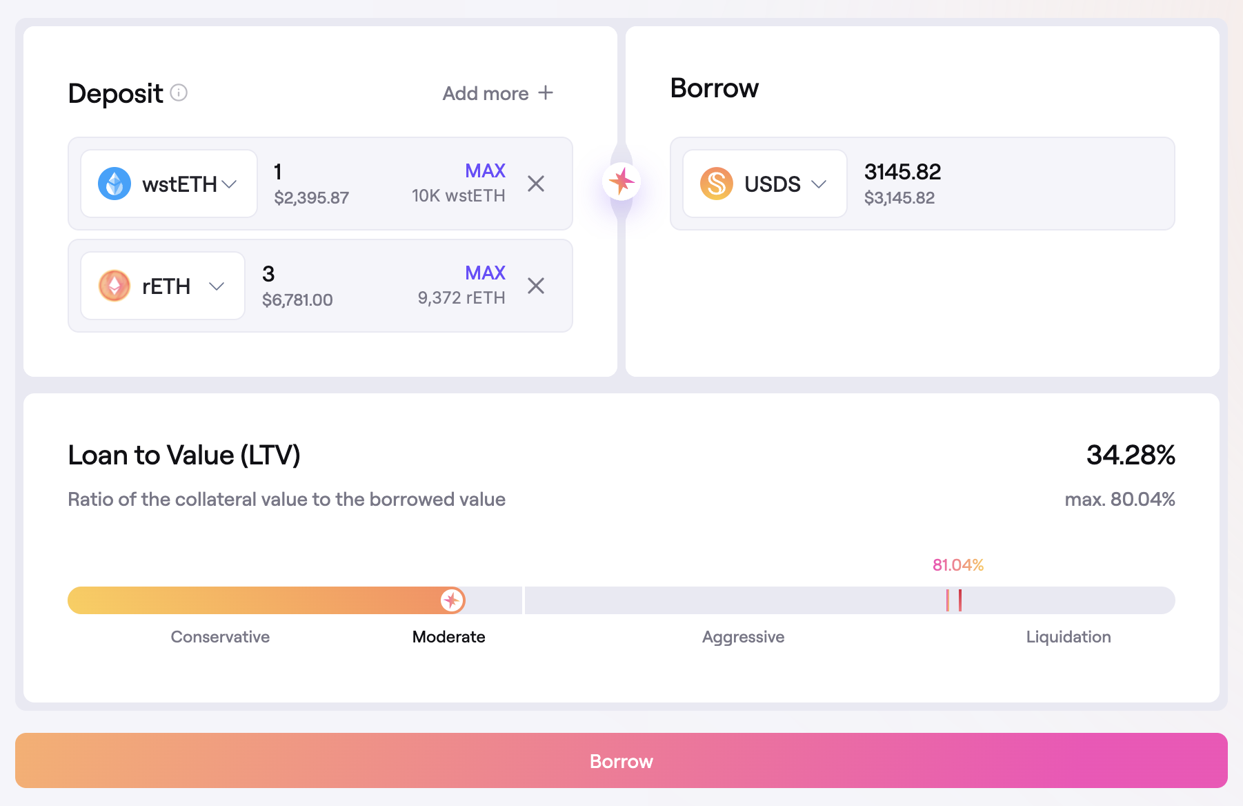 - Liquidation Indicator: The LTV slider also shows the LTV at which the position can be liquidated. The different collateral assets have a different liquidation LTV. Creating a position with multiple collateral assets will use an aggregate liquidation LTV based on the amount of each collateral.