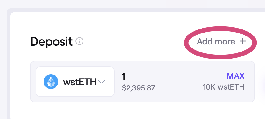 - Click on Add more + to add more crypto assets to be used as collateral. This will generate an additional deposit bar, where you can select the asset and amount.