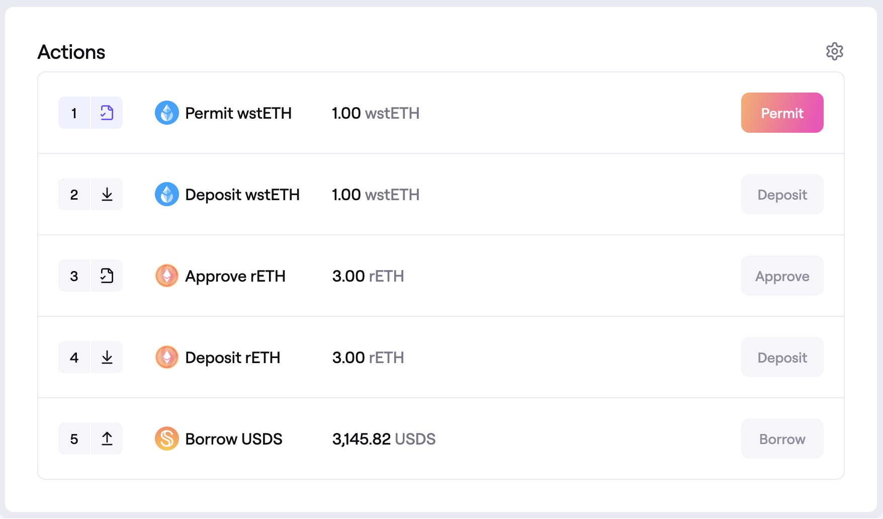 - The Actions section below shows the transactions necessary to create the borrow position. You must click the buttons to sign each transactions with the connected wallet.