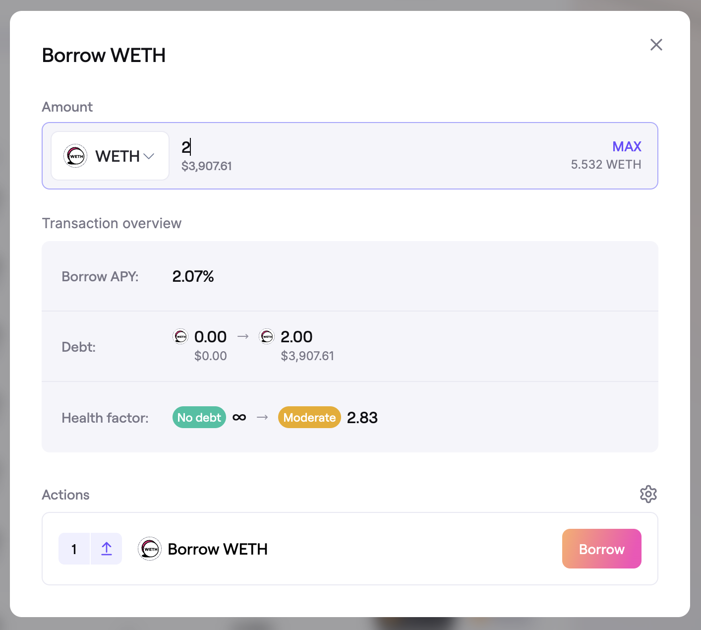 In the Borrow window you specify the amount you wish to borrow. In the Transaction overview it will display the Health Factor of the borrow position. The Actions section will guide you through the steps to create the borrow position.