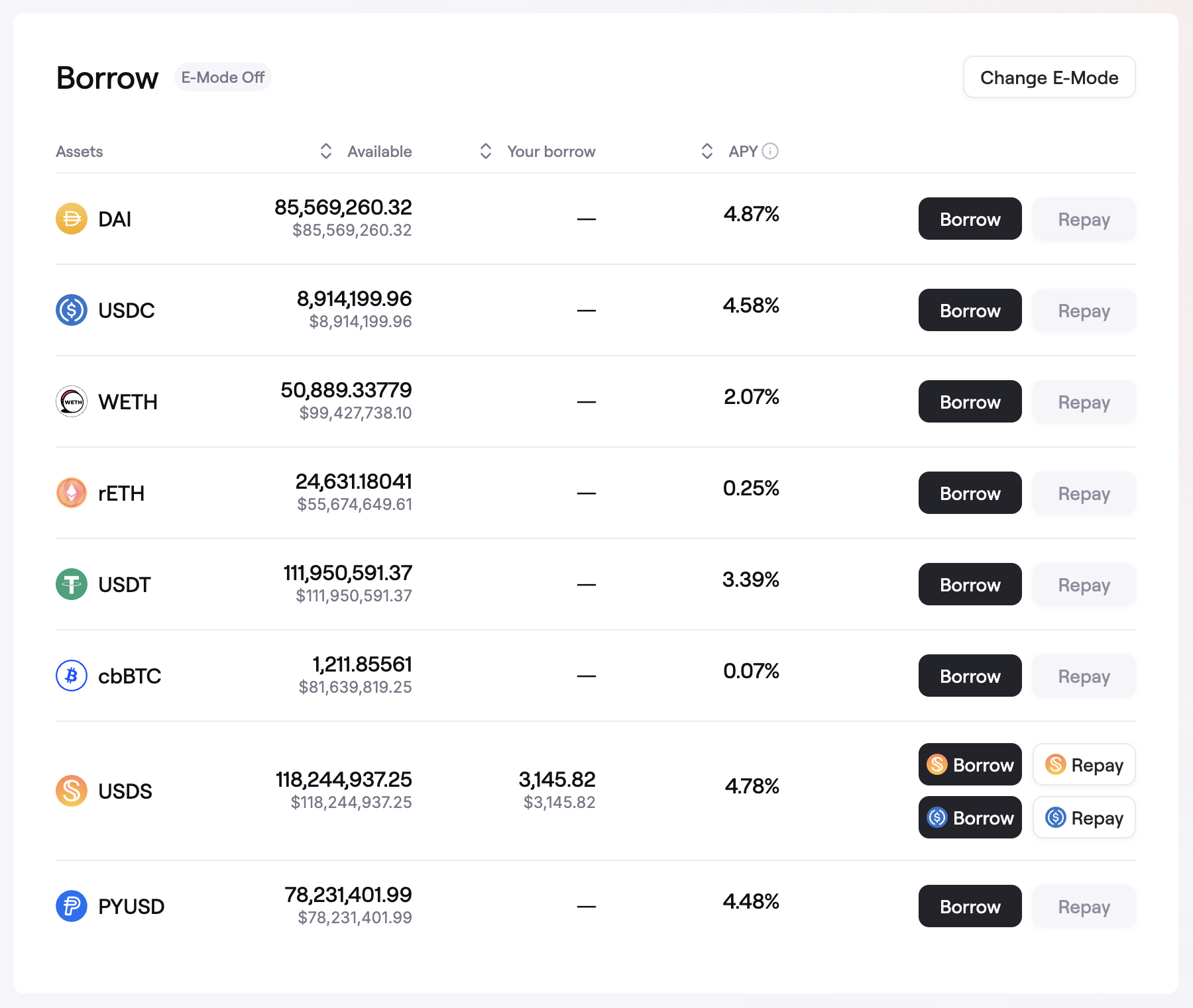 This is available between ETH correlated assets (ETH, wsETH, rETH) and stablecoin correlated assets (DAI, USDC, USDT), and allows for increased leverage. For example, you can enable E-mode if you are borrowing ETH using wstETH as collateral. If you are borrowing assets not supported in E-mode, you cannot enable E-mode. For example, if you have already borrowed Dai against ETH, you cannot enable E-mode until this loan has been repaid. You can read more about E-mode here.